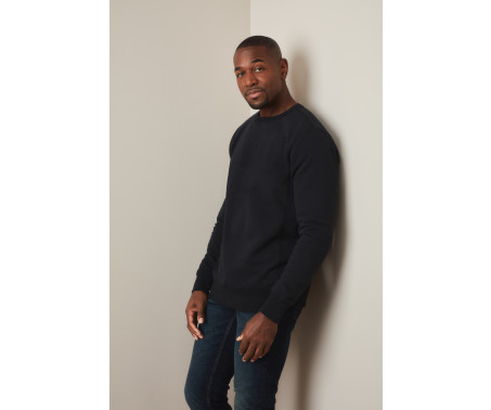 Fashionable sweatshirt for men made of warm and soft cotton-polyester-blend with a modern and sporty design, collar with rib binding and wide rib cuffs. Brushed inside for extra comfort and warmth.