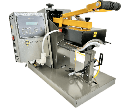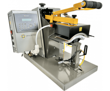 digitale (solo mod. SSH12-A). La pressione e la distanza tra il piano riscaldante e quello d'appoggio sono regolabili. Il piano d'appoggio del transfer è in teflon. Il suono può essere disattivato. Questa pressa ha un basso consumo di aria compressa. È ideale per cappelli a 6 pannelli e con cuciture centrali e inoltre il piano superiore può essere sostituito. Dovrebbe essere usata con un compressore ma funziona anche senza.
