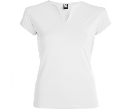 Round collar fitted t-shirt with V opening on front. Trimmed half-sleeve and side seams. Composition: