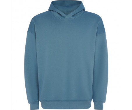 Felpa unisex oversize con cappuccio foderato in tessuto uguale. Scollo nastrato. Due tasche laterali inserite negli elementi laterali. Coste 2x1 su polsini e orlo.