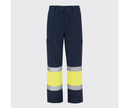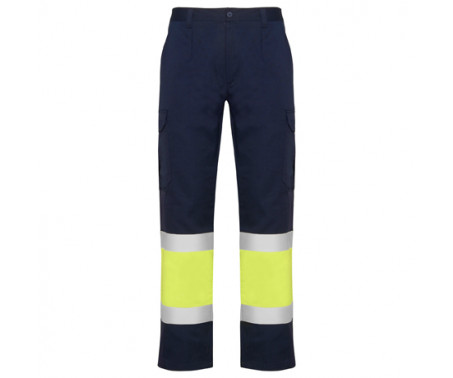 Pantaloni multitasca estivi ad alta visibilità. Elastico in vita sul retro. Due tasche con patta sul retro con chiusura in velcro con due tasche sul davanti e due tasche laterali con soffietto e patta con chiusura in velcro. Bicolore con bande fluo.