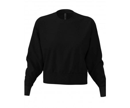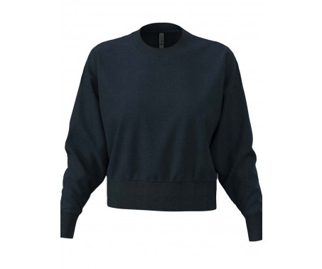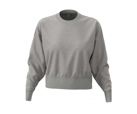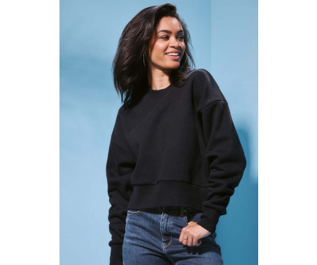 Felpa corta alla moda per donne, realizzata con una pesante miscela di cotone pettinato e poliestere riciclato, rifinita con una mezzaluna stampabile, polsini, colletto e orlo a coste larghe.