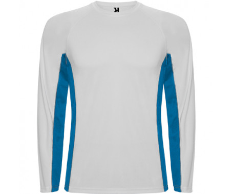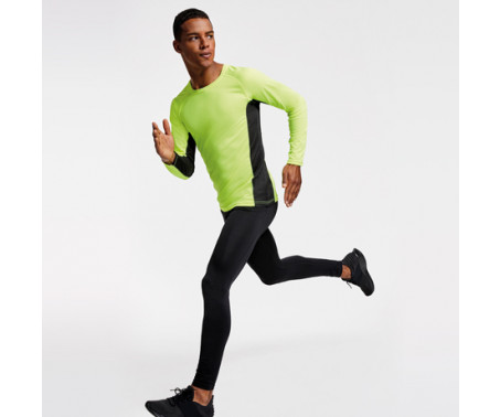 T-shirt sportiva composta da due tessuti di poliestere a maniche lunghe. Tessuto principale occhio di pernice, pannelli laterali e interni delle maniche con tessuto microforato. Girocollo con copri cuciture rinforzate al suo interno. Tessuto confortevole e facilmente adattabile al corpo.