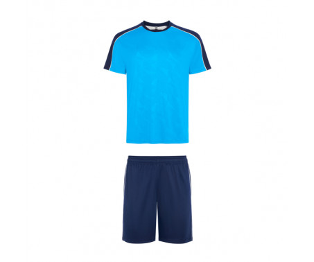 Set sportivo con T-shirt a maniche corte e short. Stampa sul pannello frontale. Bordino sulle cuciture delle maniche raglan. Dettaglio in tessuto a rete al centro del retro, lasciato libero per la rilavorazione. Pantalone in tessuto principale con fasce laterali in tessuto traspirante. Cuciture con bordino a contrasto.